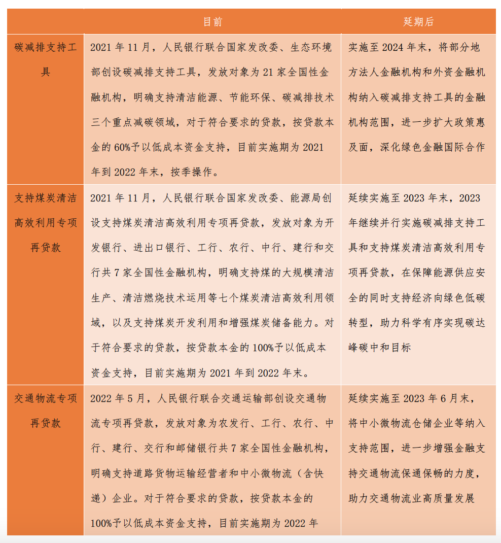具体而言,一是碳减排支持工具延续实施至2024年末,将部分地方法人金融机构和外资金融机构纳入碳减排支持工具的金融机构范围,进一步扩大政策惠及面,深化绿色金融国际合作;二是支持煤炭清洁高效利用专项再贷款延续实施至2023年末,2023年继续并行实施碳减排支持工具和支持煤炭清洁高效利用专项再贷款,在保障能源供应安全的同时支持经济向绿色低碳转型,助力科学有序实现碳达峰碳中和目标;三是交通物流专项再贷款延续实施至2023年6月末,将中小微物流仓储企业等纳入支持范围,进一步增强金融支持交通物流保通保畅的力度,助力交通物流业高质量发展。