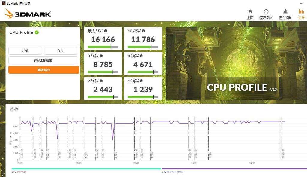 CPU部分,上面我已经放了CINEBENCH R15,R20,R23的跑分,下面我们就来跑一下3DMark,现在的新版3DMark当中,也是有测试CPU成绩的基准测试,在CPU Profilek中,跑了之后我得到了以下成绩,整体来说很棒。