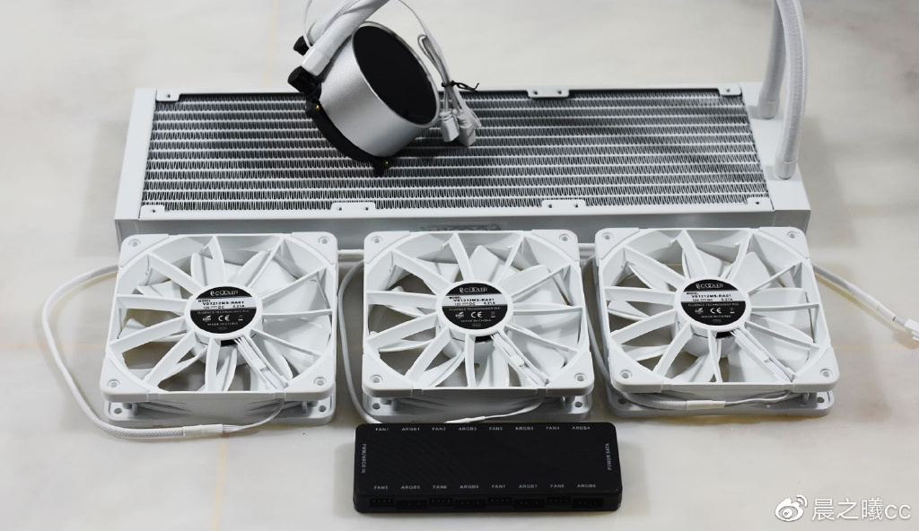 超频三 PD360水冷自带有三把风扇,为了保证使用时有较好的散热和静音效果,采用了一体铸造FDB轴承,而且还采用了涡轮增加的结构设计,在增加风压的同时也增加了风量。配合上我另购的6把超频三 EF120机箱风扇,在保证机箱内部RGB灯效的同时,也兼顾了机箱内部的散热,同时为了更好的方便我们走线,超频三PD360水冷内部是自带有一个8口的集线器,这点必须给好评。