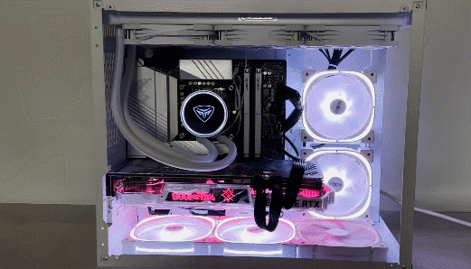 说完了单个配件,下面我们就来实测一下,看看这台电源的最终表现如何。先来一张装机完成之后的效果图,因为配件大部分都是白色,机箱也是白色海景房,整机看起来还是很漂亮的。
