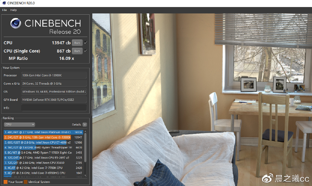 使用CINEBENCH R20和CINEBENCH R23对这颗i9 13900K进行测试,在这里我得到了以下成绩,CINEBENCH R20单核成绩为867,多核成绩13947,CINEBENCH R23单核成绩为2276,多核成绩为37383,性能可以说是非常强劲。