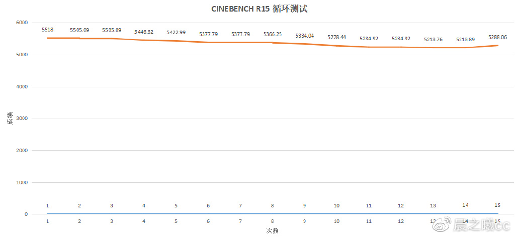而且为了测试这颗i9 13900K的持续性能释放,我也是用CINEBENCH R15进行了15次的循环测试,这里我直接用表格来展示,我们可以看到它最高分为5518,最低分为5213.76,平均为5354.51,可以说整个过程的性能释放很稳定。