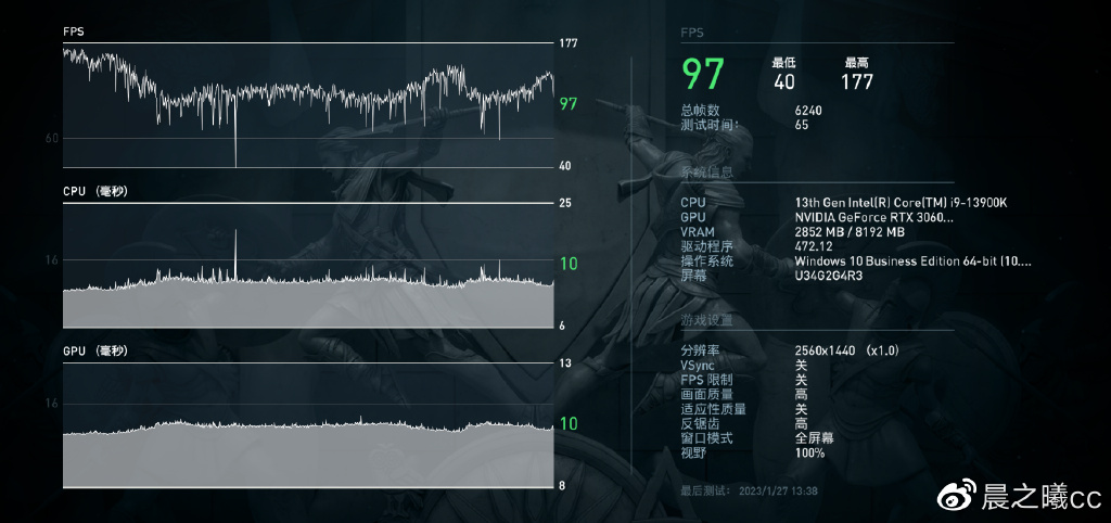 《刺客信条-奥得赛》在画质高,分辨率2560*1440下,得到了平均97帧的成绩