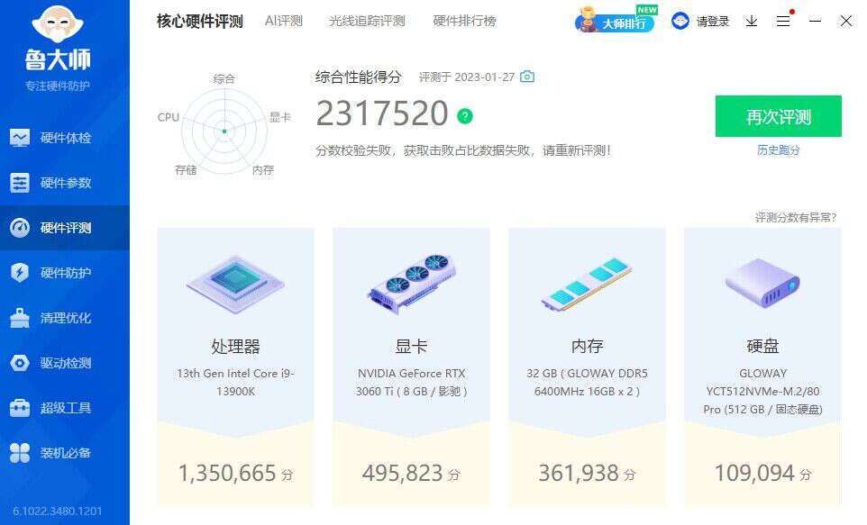 首先我们先来个鲁大师跑分,虽然这款软件一直被称为娱乐大师,跑分也不专业,但对于大众用户来说还是有一定的参数性,经过测试,得到了的总分2317520,其实中CPU得分1350665,内存得分(频率为6400)361938。