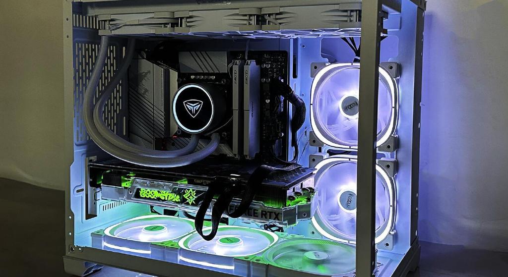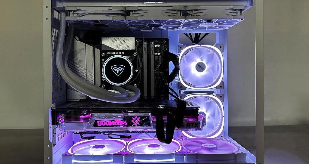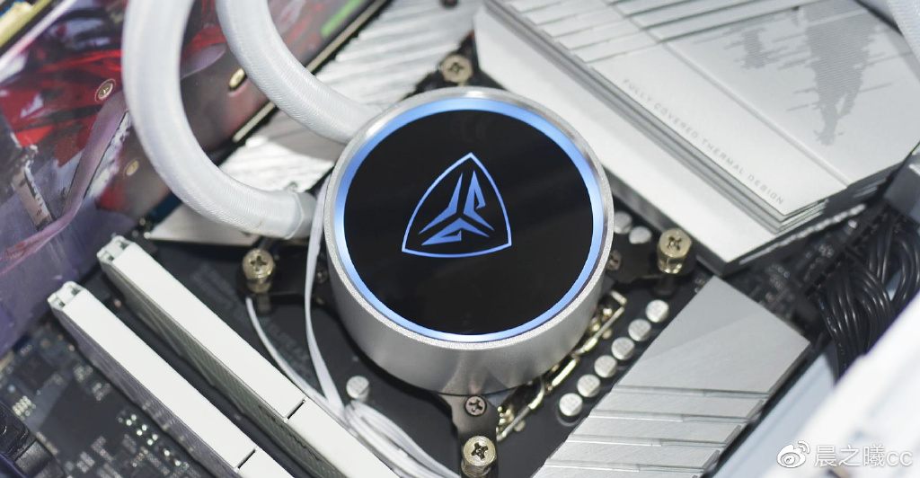 当然为了压住i9 13900K这颗性能超强的处理器,在散热方面我也是下了功夫,选择了超频三的PD360白色水冷,以及6把超频三 EF120 白色机箱风扇。通过官方我了解到超频三的这款PD360水冷它的水排是为27mm的加厚水排,这样做的好处是可以在水排内增加水冷液,并很好的降低水阻,从而大幅度的提升散热效果。而且散热冷头采用的是CNC精雕铝制设计,冷头的正面还拥有RGB灯效的Logo展示,非常漂亮。