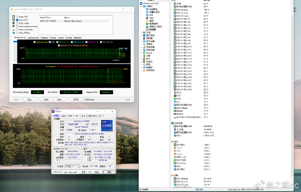 最后就是要对这台电脑进行拷机测试,来看看超频三 PD360水冷是否能够压得住这款当前可能是性能最强的i9 13900K了,打开AIDA64,单烤FPU,这颗13900K 的温度在瞬间就跑到了99度,不过在经过了约6分钟的单拷测试之后,虽然温度没有太多变化,功耗却是稳定在了260W左右,只能说这颗13900KCPU的性能太过强劲了。