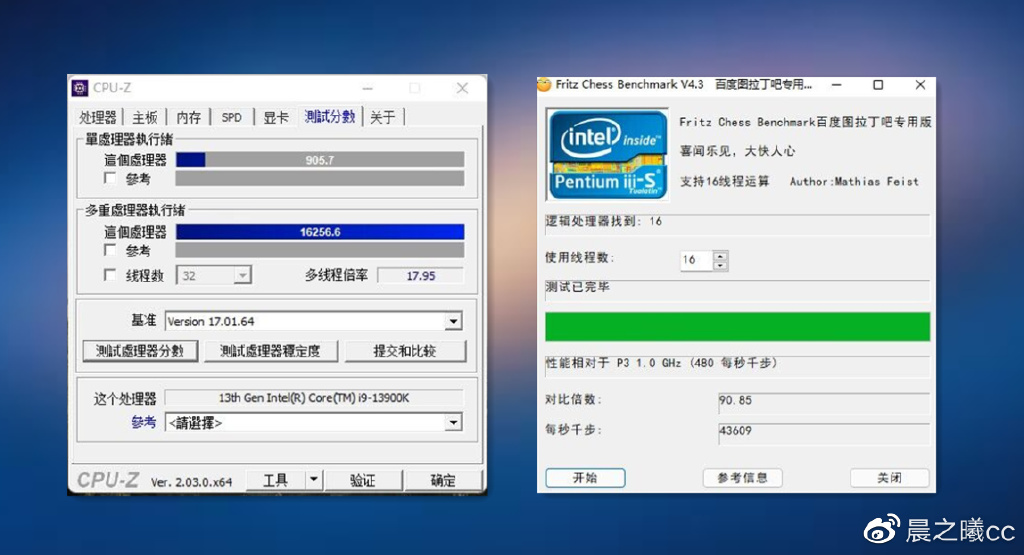 然后我们再来跑一下CPU-Z和Fritz Chess Benchmark,这两款软件都能很好的测试CPU的表现。在CPU-Z中,13900K得到 了单核905.7分,多核16256.6分;Fritz Chess Benchmark中对比倍数90.85,每秒千步43609。