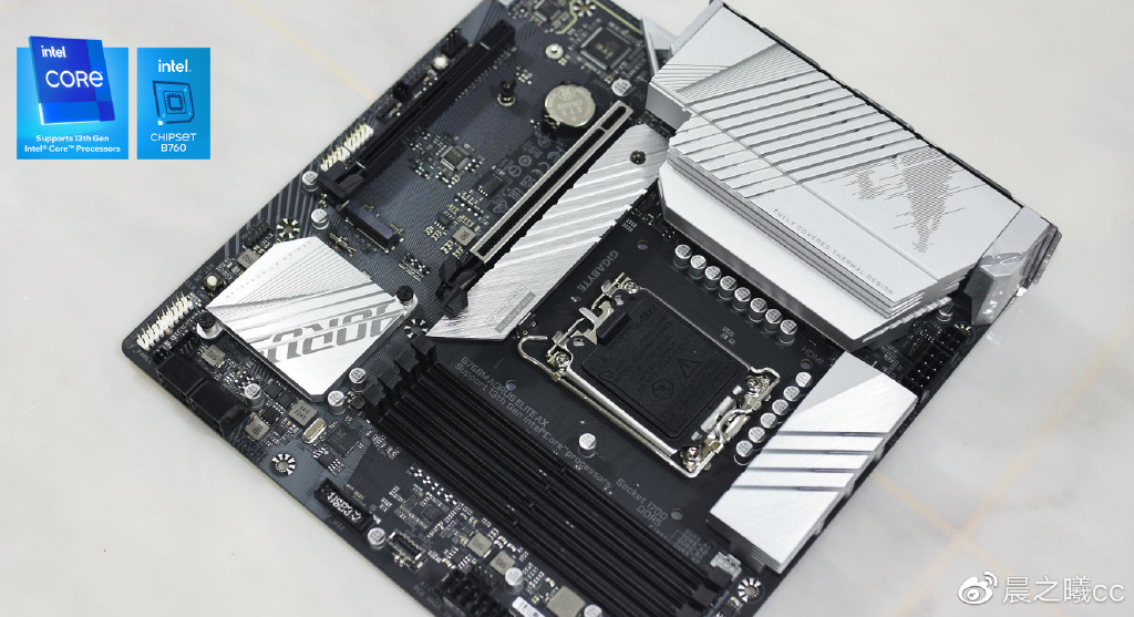 主板方面,这里我选择是技嘉B760M AORUS ELITE AX(后续简称:技嘉B760小雕WIFI),这款主板它采用14供电(12+1+1)设计,拥有4条DDR 5插槽,两个PCIe 4.0固态硬盘插口,1个PCIe 4.0*16显卡插槽。而且为了保证主板的散热,主板覆盖有大面积的散热片。