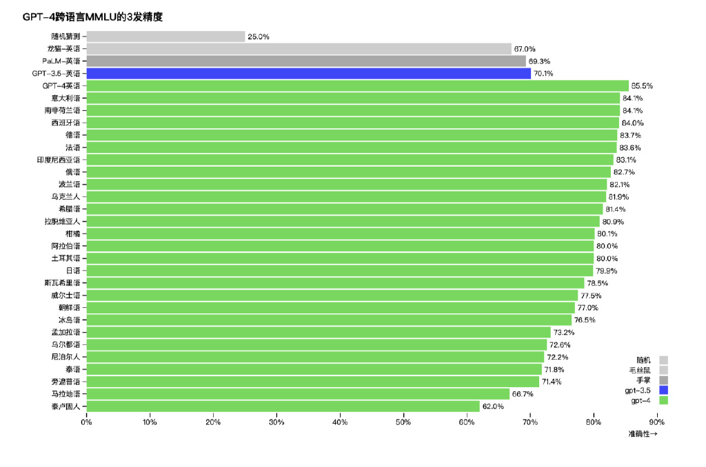 在测试的26种语言中,有24种语言,GPT-4优于GPT-3.5和其他大语言模型的英语语言性能。其中,中文达到了80.1%的准确性,而GPT-3.5的英文的准确性为70.1%。