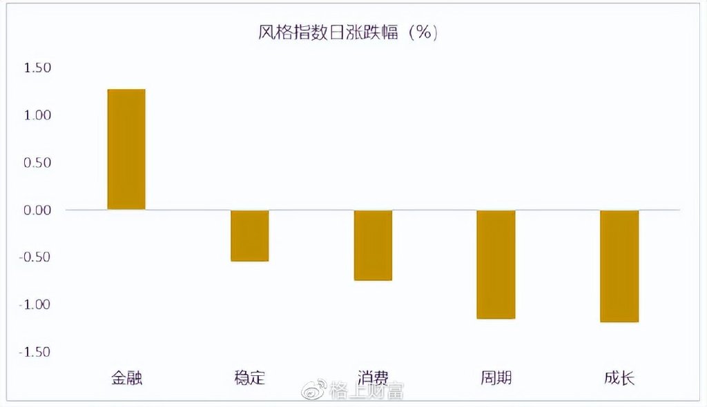 从风格指数上来看,今日多数风格表现不佳,其中金融风格的个股独自上涨,周期和成长风格的个股表现最弱。近期风格转换较为明显。