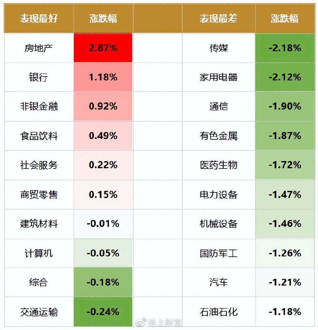 盘面上,31个申万一级行业中只有6个行业上涨,其中房地产,银行,非银金融行业领涨,涨幅分别为2.87%,1.18%,0.92%。传媒,家用电器,通信行业领跌,跌幅分别为2.18%,2.12%,1.90%。