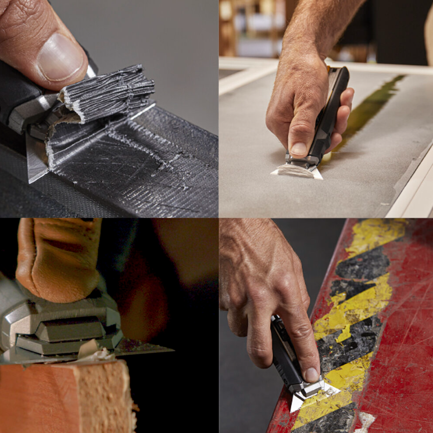 TOUGHBUILT 拓必得变形工具刀还广泛应用于家庭环境,家里存放一把变形工具刀,不用的时候,刀片收进去, 安全方便!使用的时候用切割模式可以开快递箱,切纸卡等,在刮的模式下可以帮你清除墙砖,玻璃,窗户、镜子上的标签,粘合剂以及瓷砖上的油漆、腻子等赃物。