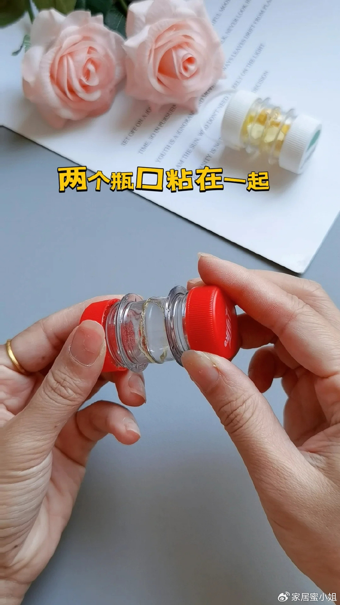 然后再使用热熔胶将这两个瓶口对准之后粘在一起,这样就变成一个两边都可以打开的小收纳盒,可以用来打耳钉戒指等一些小容易弄丢的东西。