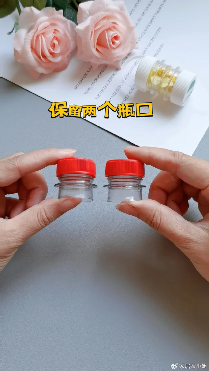 可以将饮料瓶的瓶盖剪下来,做迷你收纳盒,准备饮料瓶,将盖子连同瓶子的一小部分切开,保留两个瓶口的位置。