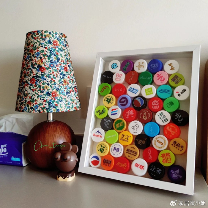 积攒了很多饮料瓶盖,可以将这些花花绿绿五颜六色的饮料瓶盖全都集中在一起,用热熔胶粘贴在画框上制作一个装饰画,纯手工制作,满满的成就感。