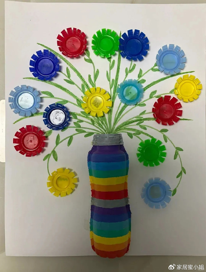 还可以将瓶盖剪开成太阳花的形状,然后放在卡纸上,涂上喜欢的颜色,制作一个美丽的艺术品。