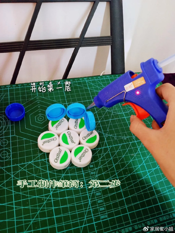 收集多个饮料瓶盖,制作一个笔筒,只要准备一个热熔胶枪就可以了,先用7个瓶盖粘在一起做一个底座,然后开始一层一层的往上粘。