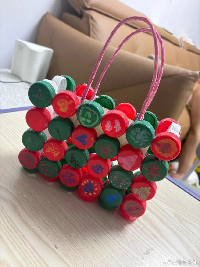 家里有上学的娃,喝完的饮料瓶盖子一定要积攒一些,可以给娃做手工,收集各种颜色的瓶盖,然后用热熔胶让它们粘在一起,可以自由组合发挥想象力,再用丙烯马克笔涂上颜色,这色彩缤纷的手提包就完成了。