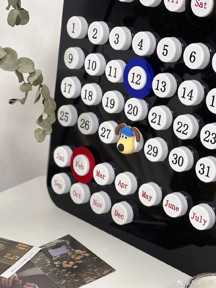 还可以用这种方式自己diy一个瓶盖日历,准备白色的瓶盖,然后标上数字,用热熔胶粘贴在亚克力板上,放在家里,既是一个美美的艺术品,也是一个日历牌。