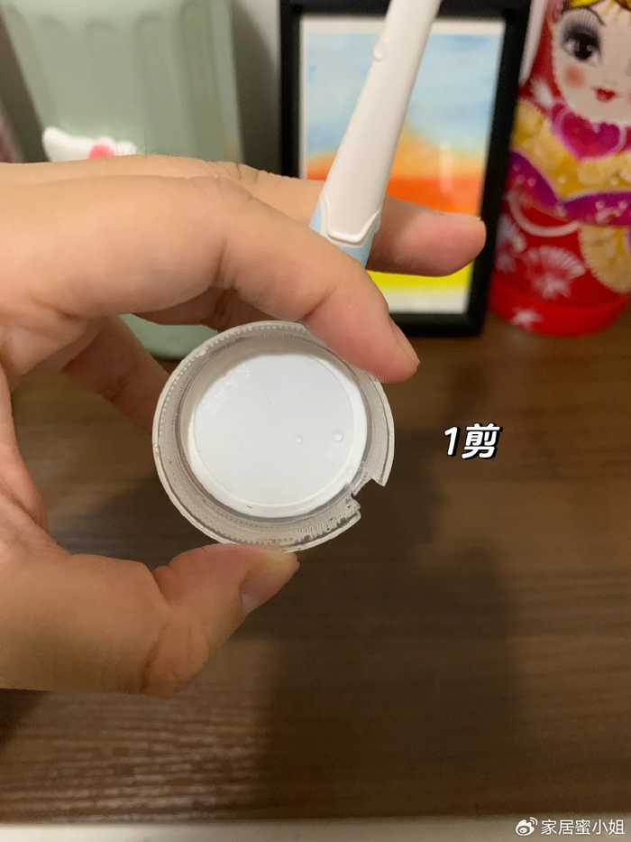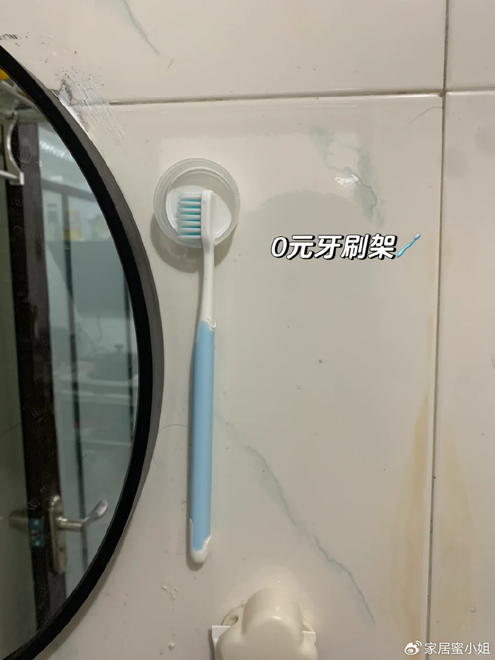 把饮料瓶盖剪开,一个小缺口正好能够卡住牙刷,再把饮料瓶盖粘在墙面上,这样牙刷就能墙上收纳了,拿起取下来都很方便。