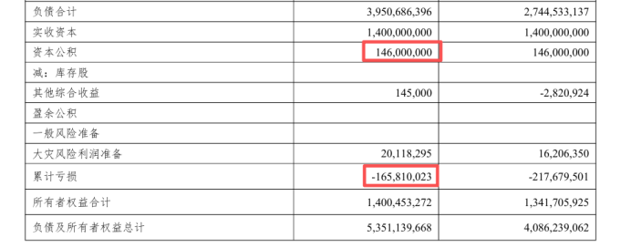 在随后的数年间,该公司的资本公积经历了多次变动。2012年,受巨灾风险准备金调整的影响,资本公积增至1.72亿元;2013年,股东增资,资本公积增至2.95亿元。然而,2014年因提取巨灾风险准备金,资本公积减少了近0.60亿元,回落至2.36亿元;2015年,公司又将0.90亿元资本公积转增股本,此后资本公积长期维持在1.46亿元的水平,直至目前用于弥补累计亏损。