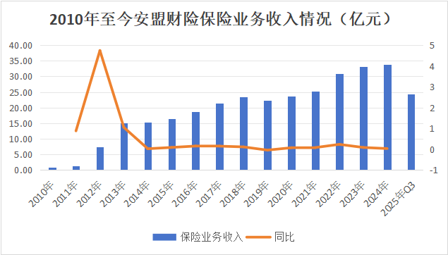 从收入端来看,安盟财险保险业务收入整体呈现上升态势。近几年增速明显,截至2024年末达33.90亿元,同比增长2.13%。今年前三季度保险业务收入达24.24亿元,为去年总收入的71.5%,以此速度推算今年保费收入或能与去年持平。