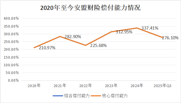 从偿付能力来看,安盟财险偿付能力虽存在波动,但综合、核心偿付能力均处于较高水平。截至2025年三季度,该公司综合、核心偿付能力均为276.10%。