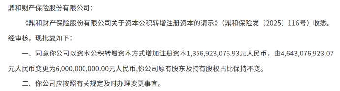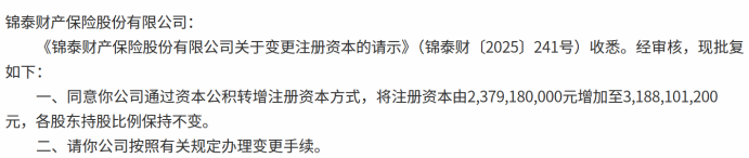 其中,鼎和财险决议显示,其通过资本公积金转增的方式增加注册资本金,该公司注册资本增至60亿元。该笔转增事项于9月获批。而锦泰保险决定将增资扩股溢价所形成的部分资本公积,合计8.09亿元,转增为注册资本。7月转增获批后,该公司注册资本将由23.79亿元变更为31.88亿元。