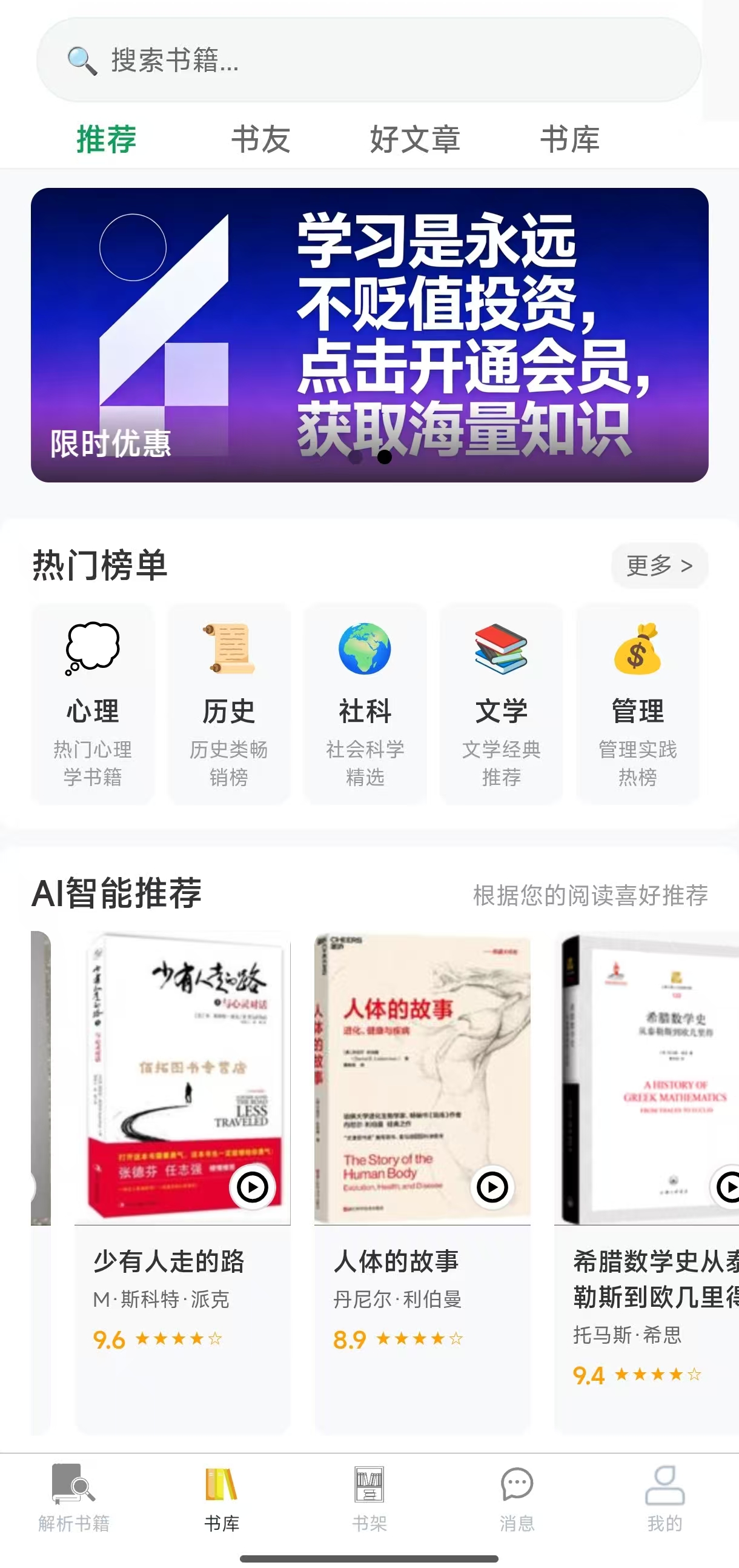 亮点解析:以“知识服务”为核心,提供大量专家解读的课程和听书产品。对商业、社科类书籍的解读条理清晰,能帮助用户快速建立认知框架。电子书资源精选质量高。